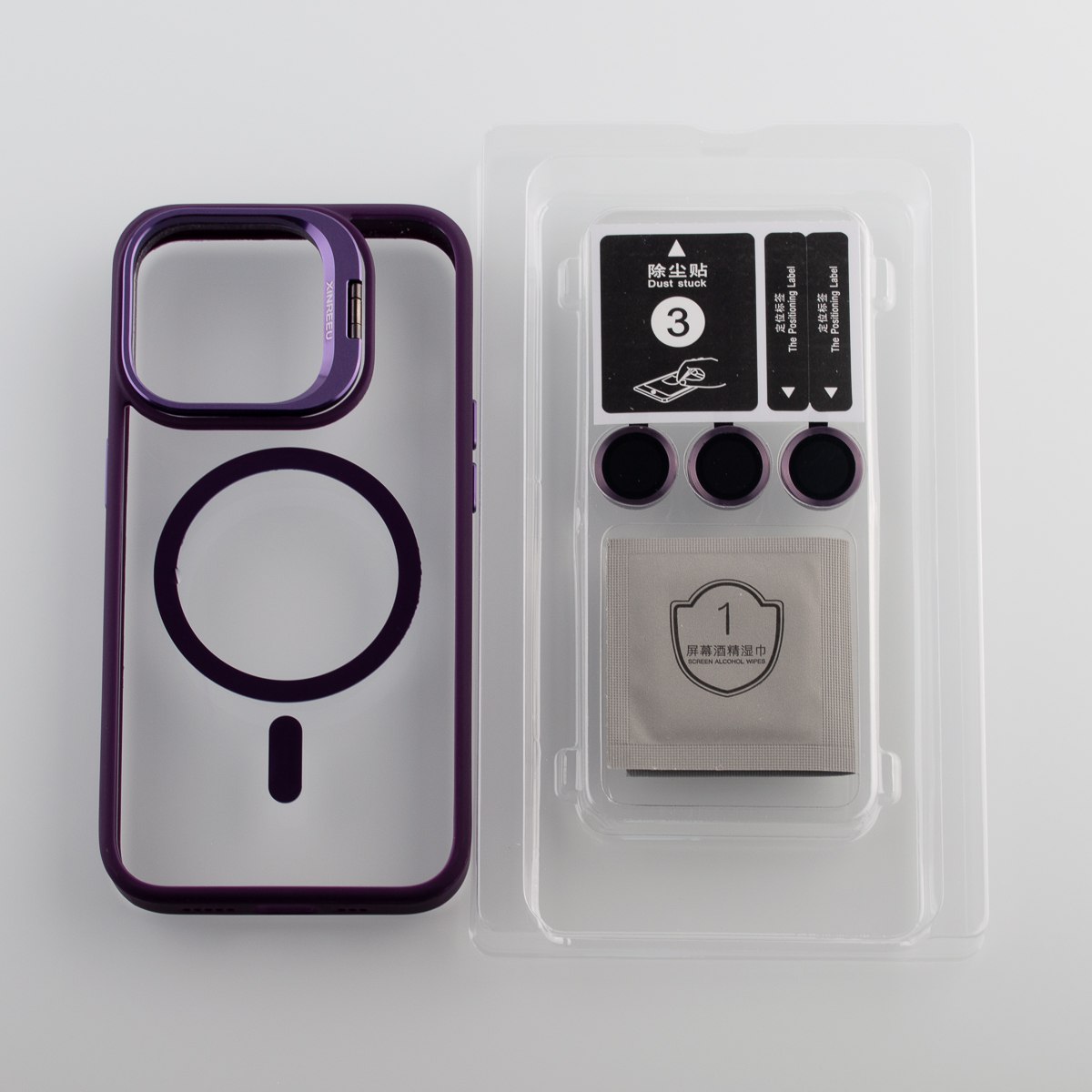 Также особенностью этого чехла являются защитные линзы для камеры, которые поставляются в комплекте с набором салфеток и стикером для нанесения. Линзы гармонично сочетаются с бортиками чехла и металлической рамкой вокруг камеры, которая не только обеспечивает защиту камеры, но и функционирует как подставка.